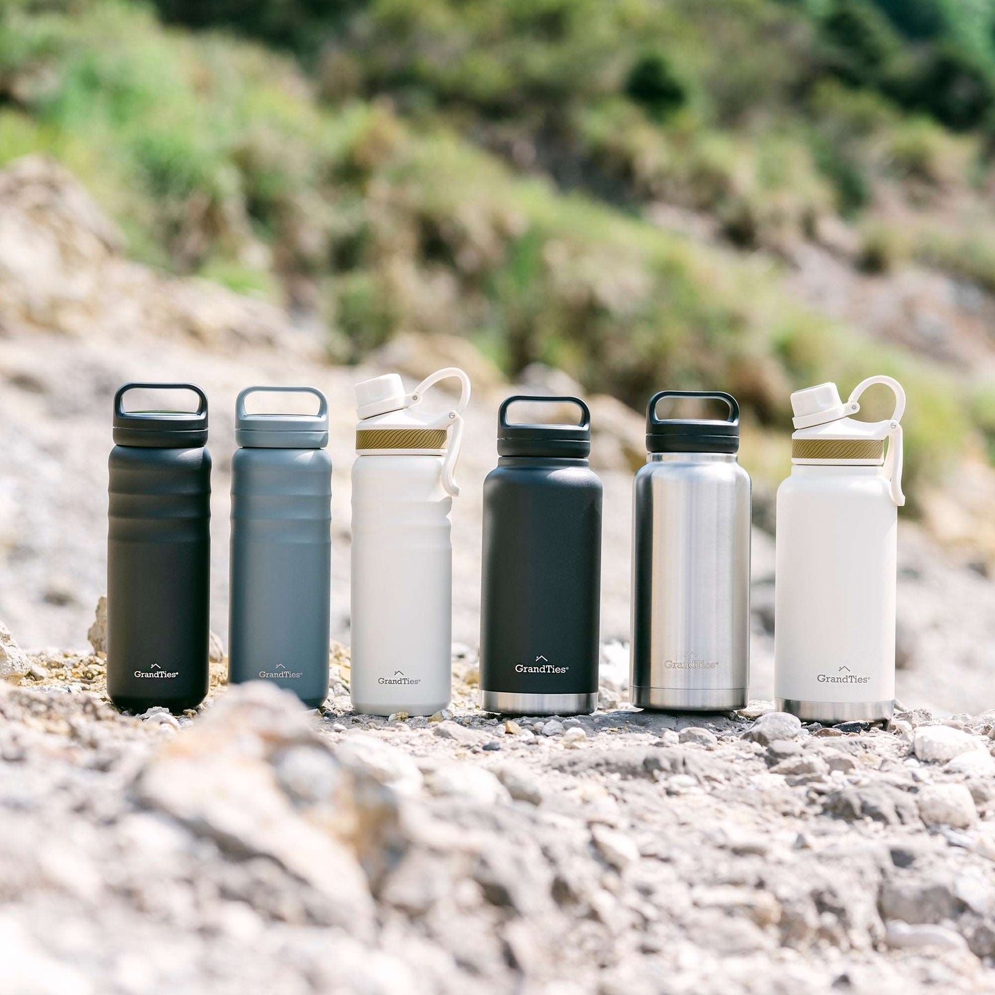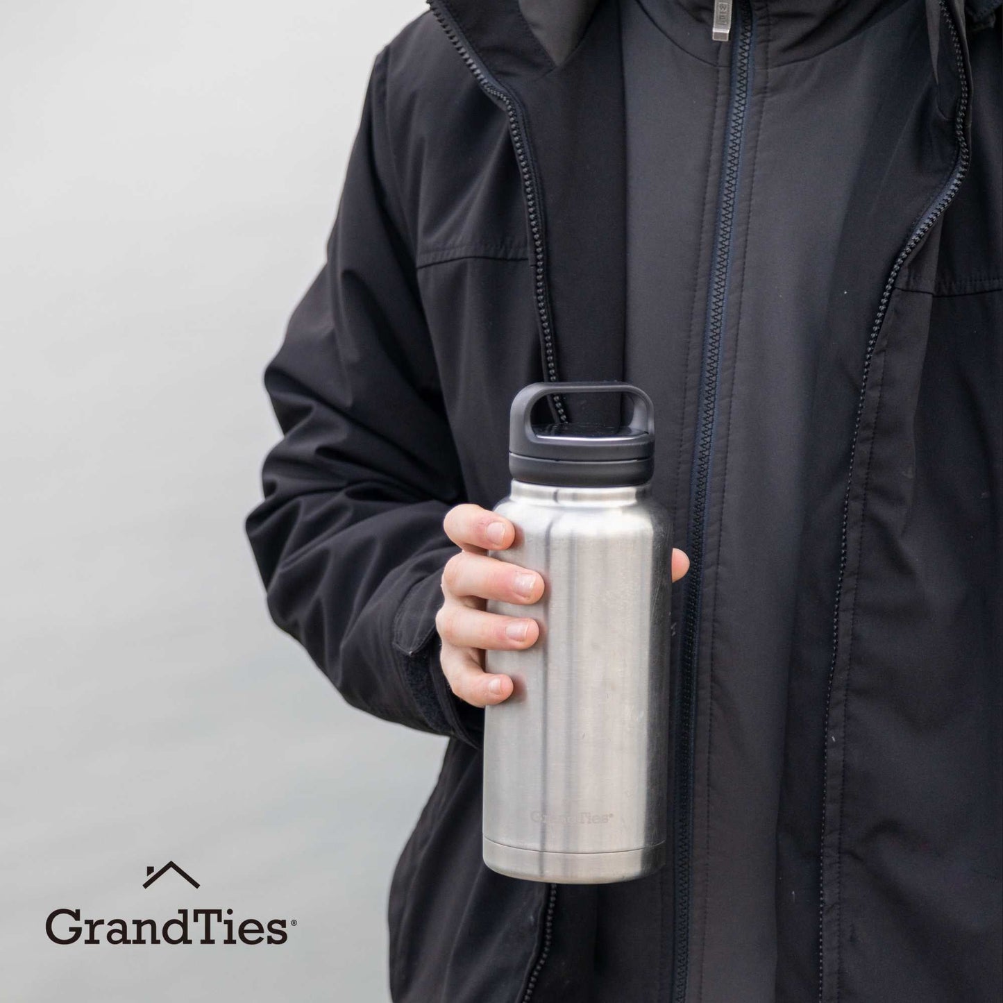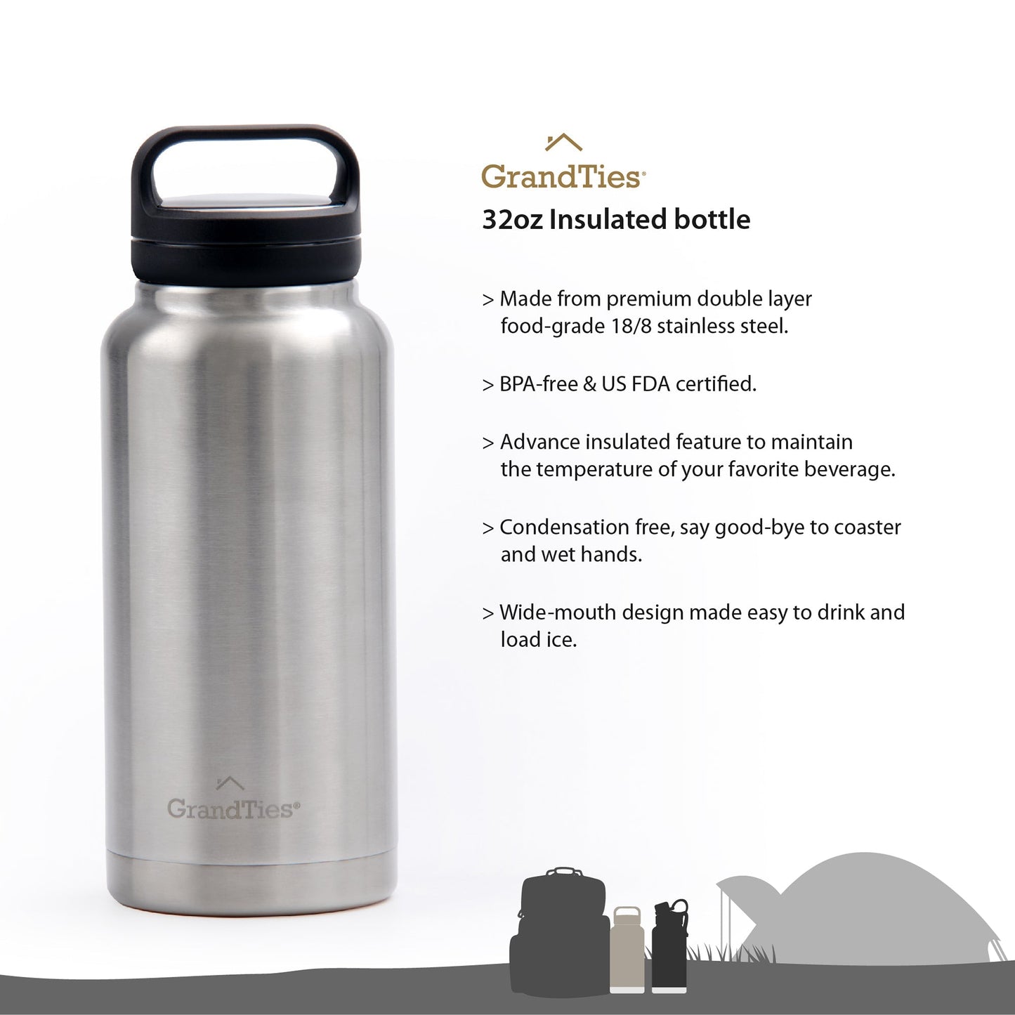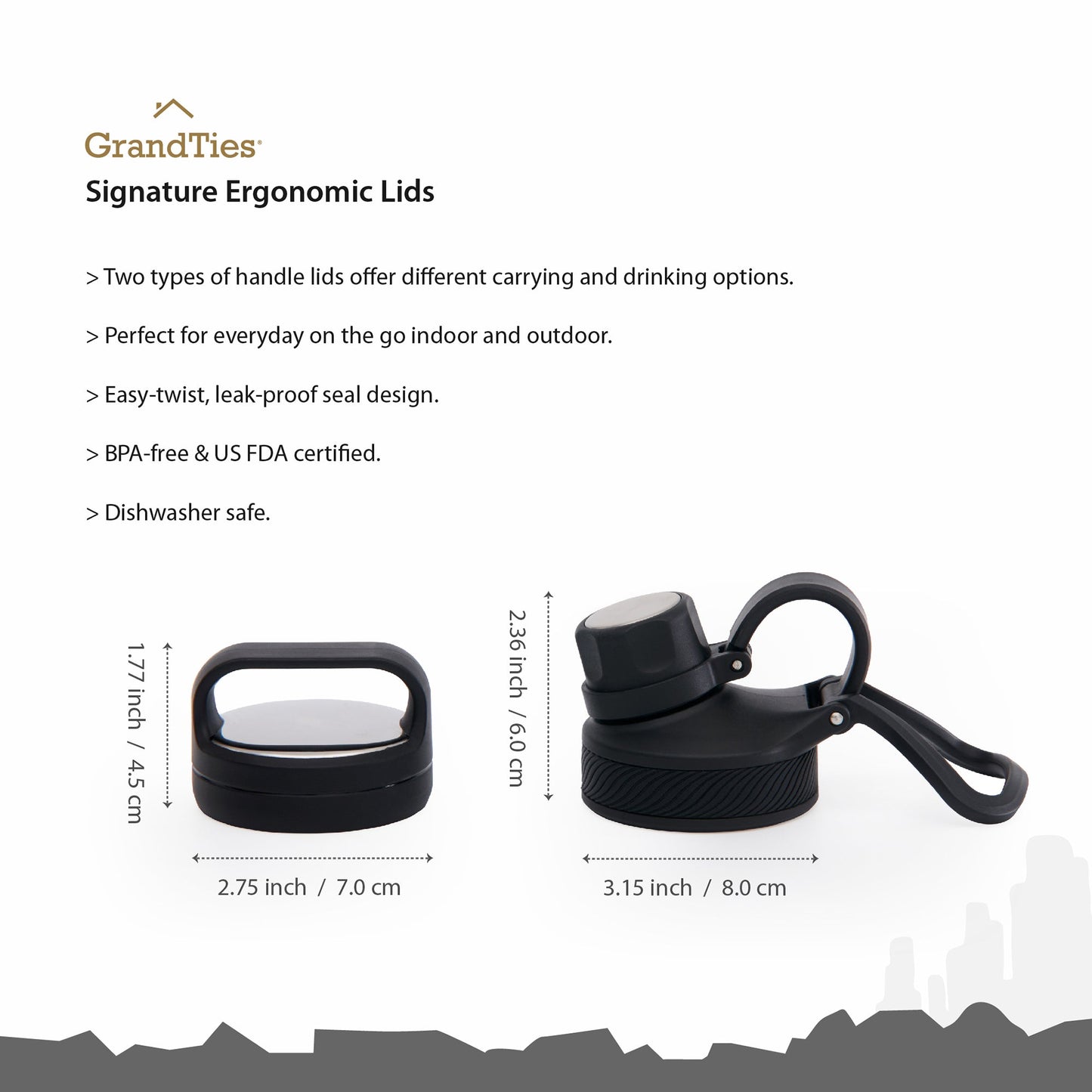 Insulated Travel Water Bottle with Two Handle Lids | 32oz/946ml- Classic Silver